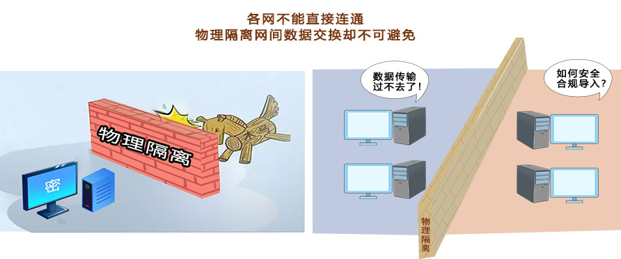 在當(dāng)今信息化、數(shù)字化時代,各種數(shù)據(jù)傳輸和儲存技術(shù)發(fā)展迅速,各安全領(lǐng)域行業(yè)對跨網(wǎng)數(shù)據(jù)交互需求日益迫切,數(shù)據(jù)傳輸?shù)陌踩煽啃詫τ谡麄€過程的重要性不可忽視。應(yīng)如何解決網(wǎng)絡(luò)安全與效率之間的矛盾,如何安全合規(guī)地實(shí)現(xiàn)跨網(wǎng)數(shù)據(jù)單向?qū)?導(dǎo)出、數(shù)據(jù)交換應(yīng)用。依據(jù)《計算機(jī)信息系統(tǒng)國際互聯(lián)網(wǎng)保密管理規(guī)定》的要求 :“涉及國家秘密的計算機(jī)信息系統(tǒng),不得直接或間接地與國際互聯(lián)網(wǎng)或其它公共信息網(wǎng)絡(luò)相聯(lián)接,必須實(shí)行物理隔離。”