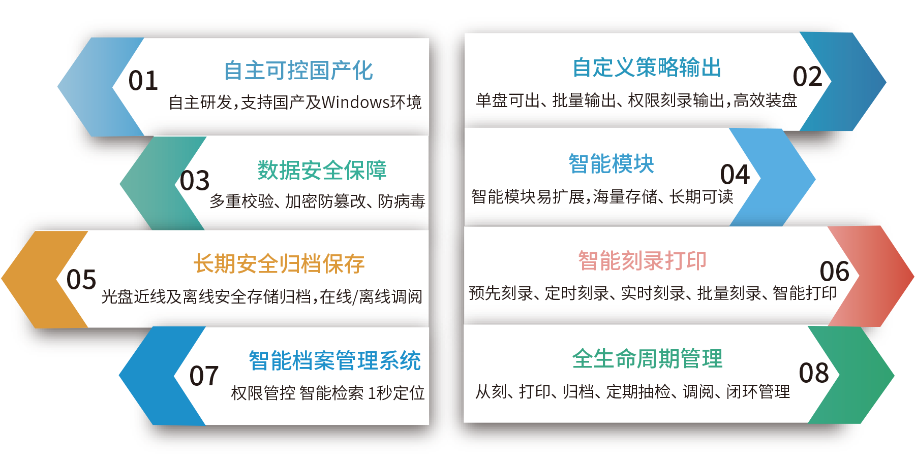 根據(jù)目前市場上無論是黨政單位、檔案行業(yè)、公采行業(yè)、公檢法紀(jì)及軍工涉密等保密行業(yè)均需滿足檔案長期保存歸檔的要求。依據(jù)檔案政策法規(guī)相關(guān)要求,符合電子檔案長期安全管理要求的存儲介質(zhì),主要有磁介質(zhì)、光介質(zhì)、縮微膠片三種。所以現(xiàn)在各單位在選擇離線方式中需要用到光介質(zhì)。那么如何選擇既能實現(xiàn)海量存儲、高效管理,又能確保檔案數(shù)據(jù)長期安全穩(wěn)定保存策略呢?成為當(dāng)前亟待解決的關(guān)鍵問題。